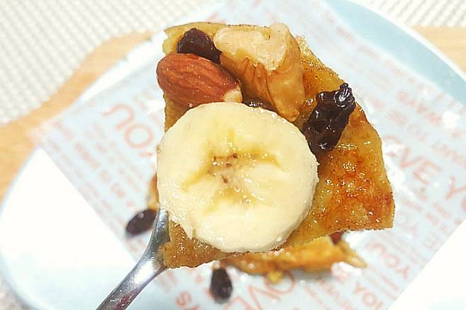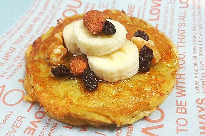 시럽 대신 꿀 약간 뿌리고 바나나와 견과류로 토핑 해주면 건강에도 좋고 맛도 좋은 계란 팬케이크 완성입니다.