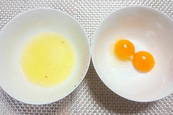 먼저 계란 2개를 그릇에 깨 주신 후 흰자와 노른자를 분리해 주세요. 노른자는 숟가락으로 뜨면 잘 분리되더라고요.