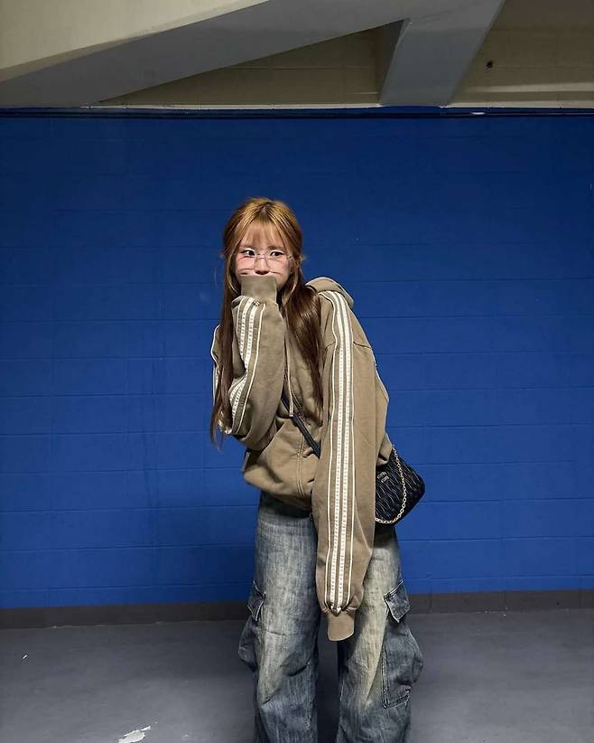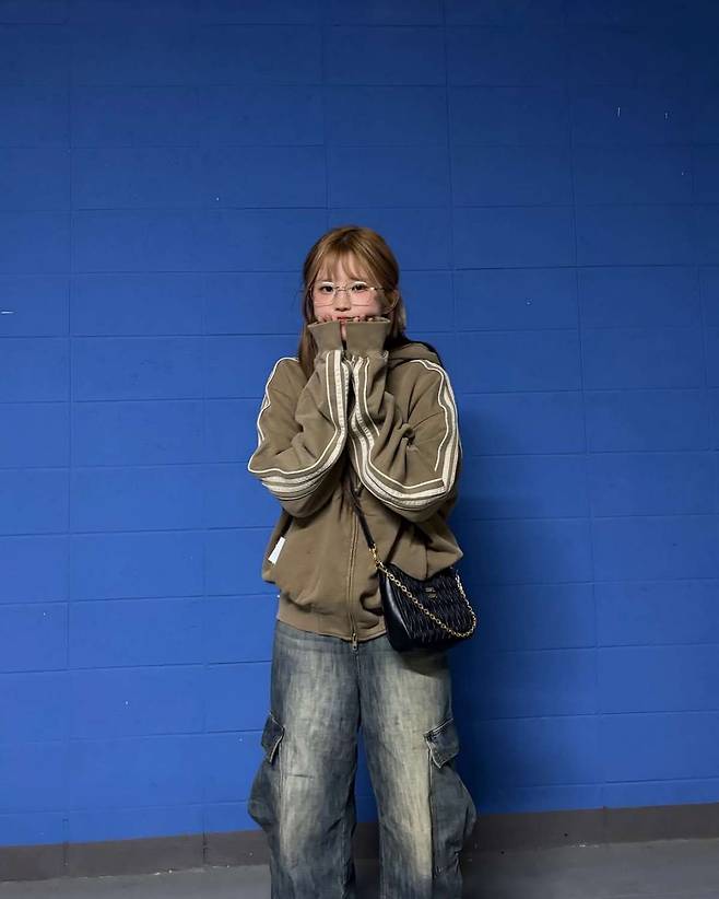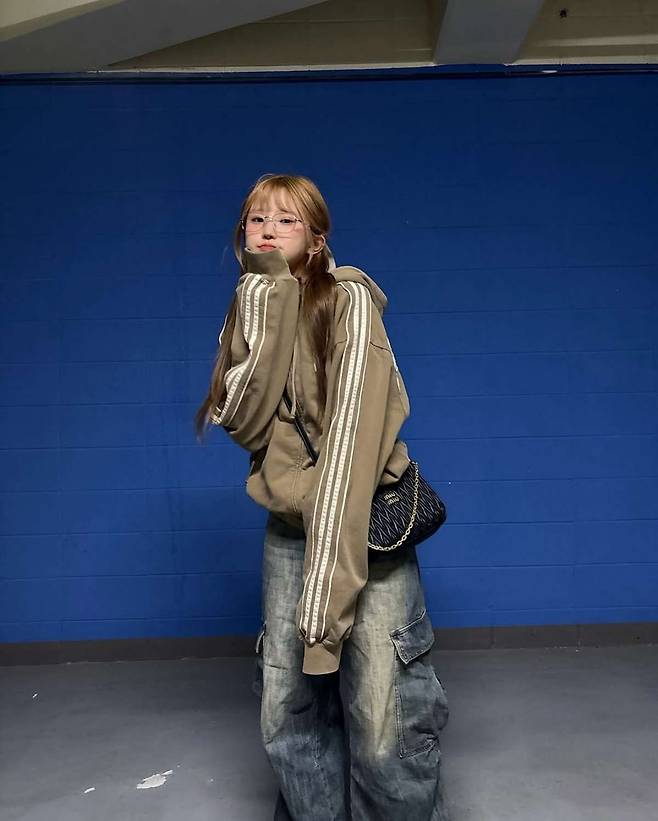 첫 번째 사진에서 송하영은 카키색 오버핏 후드 집업에 빈티지 워싱이 돋보이는 카고 팬츠를 매치했다. 후드 집업의 소매에는 굵은 라인 디테일이 더해져 스트릿 무드를 강조했으며, 전체적인 실루엣은 손등을 가릴 만큼 여유롭게 떨어져 트렌디함을 더했다. 여기에 블랙 퀼팅 크로스백과 둥근 프레임의 안경을 더해 캐주얼하면서도 귀여운 포인트를 완성했다.