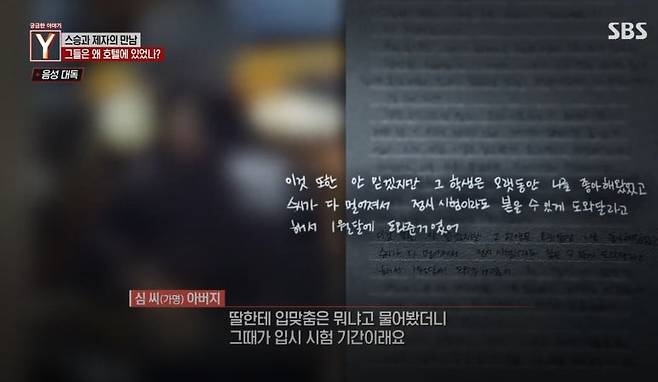 박 씨가 자녀를 데리고 남학생 제자와 호텔에 가고 외부에서 입맞춤을 한 것까지는 CCTV로 확인됐습니다. 이 문제에 대해 A 씨는 "딸이 다니던 학교는 일반 고등학교가 아니었고, 학생들과 함께 '호캉스'를 가서 사진을 찍는 일이 있었다"라고 말하며 "B군의 대학 면접이 다음날 있었고 '근처에서 자고 싶다'고 해 아이도 있어 간이침대를 결제했다"라고 설명했습니다.