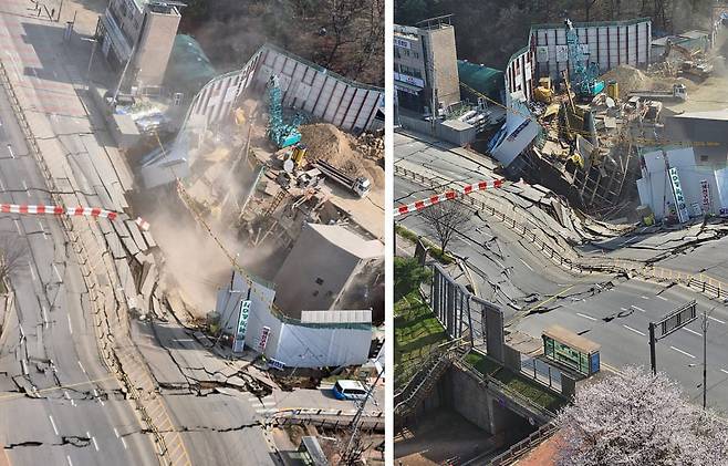 지하 공간이 붕괴하면서 지상 도로와 인근 상가 시설물 일부도 무너졌습니다. 이로 인한 추가 인명피해 등은 확인되지 않았습니다.