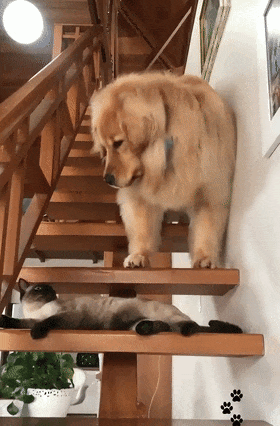 계단을 내려가려다 고양이에게 길을 막히자, 낑낑거리며 어쩔 줄 몰라하는 골든 리트리버도 있습니다. 덩치는 산만 하지만 고양이 앞에서는 꼼짝 못 하는 모습은 '반전 매력'을 보여줍니다.