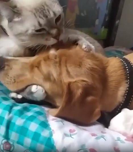고양이는 조용히 얼굴을 숙여 강아지의 눈가와 이마를 천천히 핥기 시작합니다. 혀끝이 닿을 때마다 강아지의 털이 살짝씩 흔들리고, 고양이의 눈에는 오직 그 작업에만 몰두하는 집중이 서려 있습니다. 귀를 핥고, 볼을 핥고, 다시 눈가를 돌보는 그 모습은 마치 “오늘은 내가 다 해줄게. 너는 아무것도 하지 마”라는 듯 다정한 간호 같기도 했습니다.