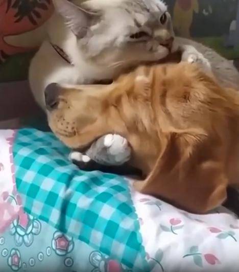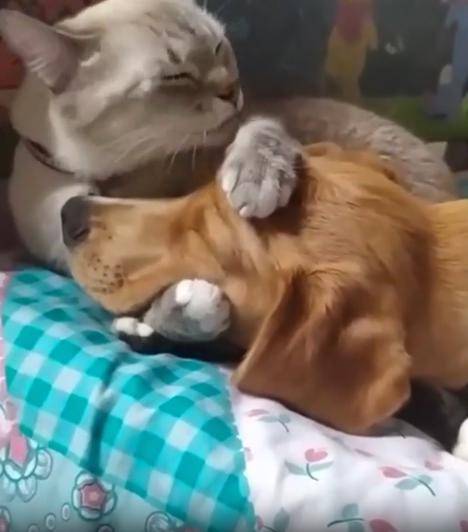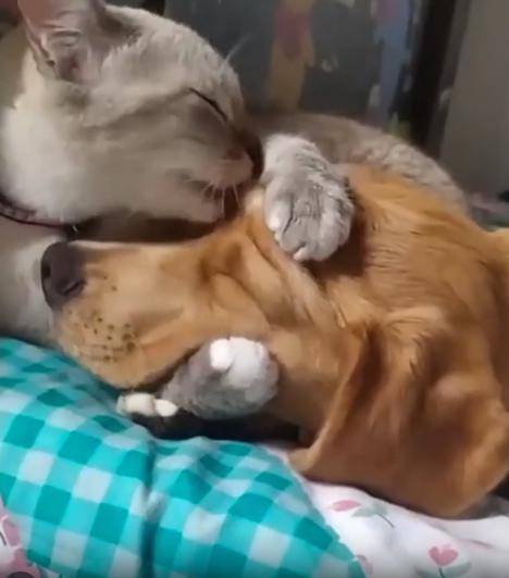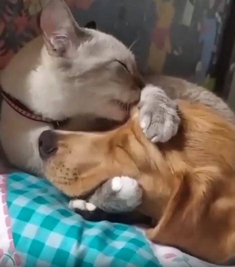 고양이의 앞발 안에 고이 안긴 강아지의 얼굴처럼, 우리도 때로는 아무 말 없이 감싸주는 존재가 필요할지 모릅니다. 말보다 먼저 닿는 손, 눈빛보다 먼저 와 닿는 따뜻한 접촉. 이 작고 조용한 장면이 마음 한켠을 어루만지듯 지나갑니다.