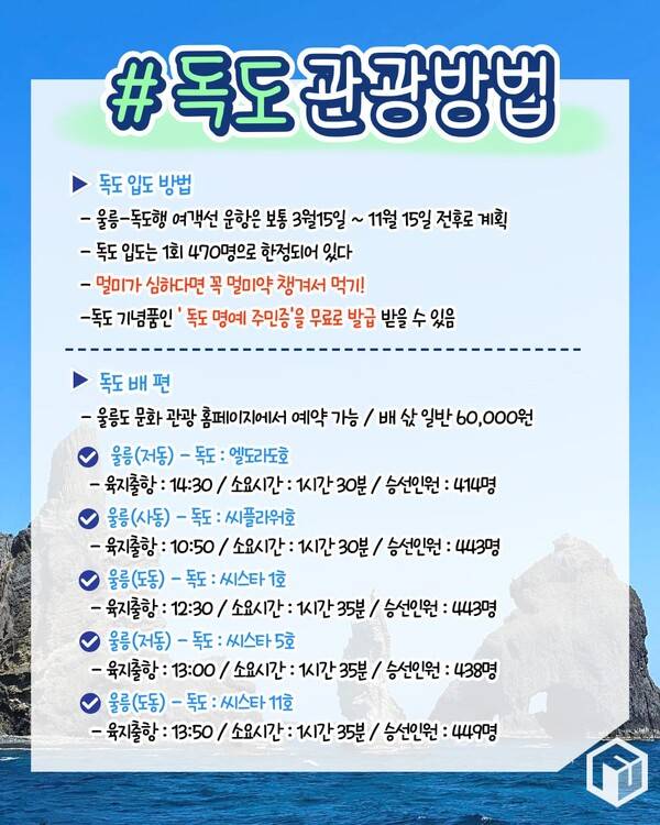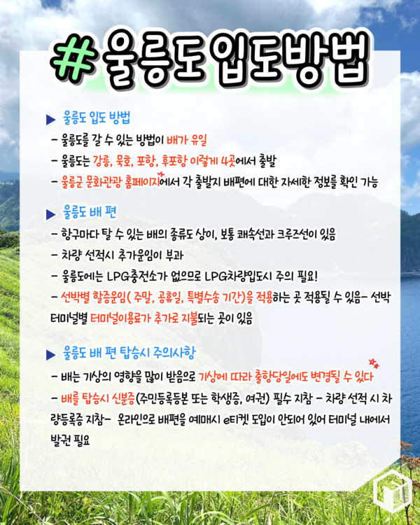 울릉도 입도방법부터 배편 가격, 주의사항 또 관광지까지 꼼꼼히 정리했으며 독도 입도 방법도 준비했으니 이번 여름 색다른 국내여행으로 울릉도와 독도 여행을 떠나보시는 건 어떠신가요?