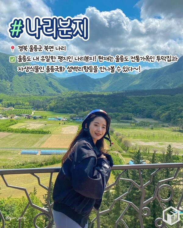 울릉도의 유일한 평지라고 불리는 나리분지는 과거 울릉도 사람들이 살고 있는 마을인데요. 울릉도는 화산섬이라는 특성상 울퉁불퉁한 땅이 대부분이지만, 그중 중앙에 칼데라호가 무너지면서 산으로 둘러싸인 평지가 만들어진 것이 나리분지입니다.