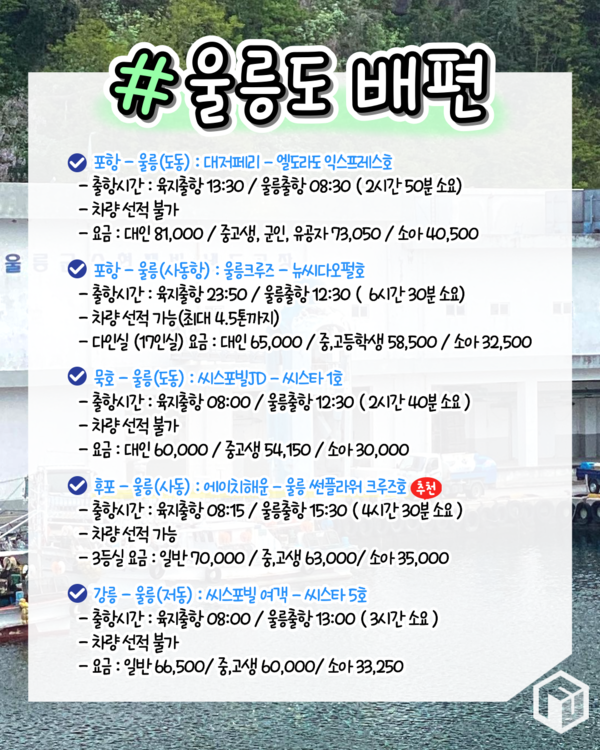 울릉군 문화관광 홈페이지에서 각 출발지 배편에 대한 자세한 정보를 확인할 수 있습니다. 또 선박별 터미널 이용료 및 할증도 추가될 수 있으니 꼭 확인하셔야합니다.