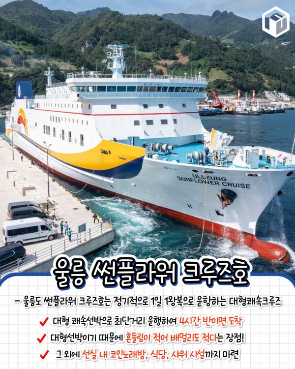 울릉도 입도 가능한 선사 중 추천드리는 선사는 에이치해운의 '썬플라워 크루즈호'입니다. 썬플라워 크루즈호는 울릉도를 정기적으로 1일 1왕복하는 대형 쾌속 크루즈으로 4시간 반이면 울릉도를 도착할 수 있습니다.