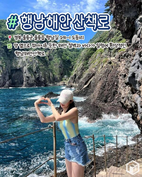 두 번째 여행지, 행남해안산책로는 울릉도 뿐 아니라 우리나라에서 손꼽힐만한 해안산책로인데요. 기암절벽과 천연동굴을 따라 걸으면 비취색 바다 풍경을 만끽할 수 있고 이국적인 정취를 느낄 수 있습니다.
