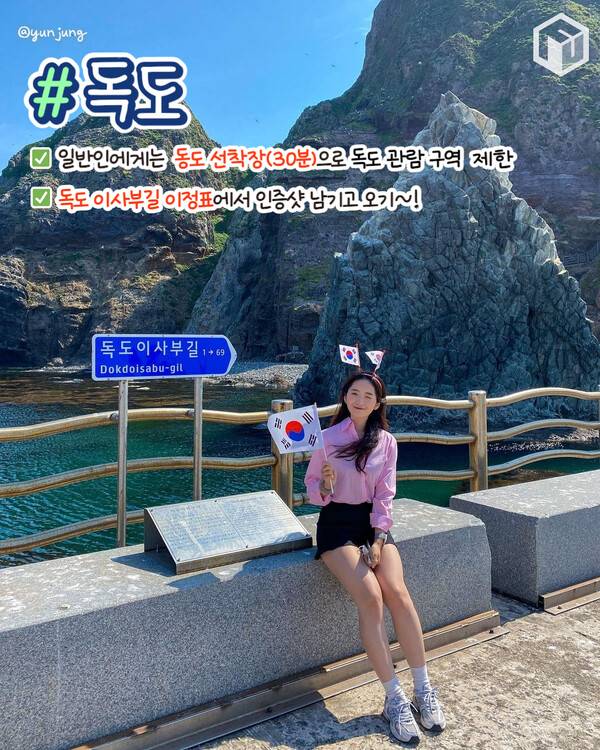 거대한 바위 중에서도 한반도를 닮은 '한반도 바위'는 독도의 국적을 드러내 온 상징물이기도 합니다. 또 독도이사부길 이정표에서 인증샷을 남기는 것이 하나의 독도 관광 포인트니 놓치지 마시길 바랍니다!