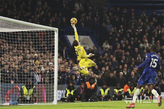 [런던=AP/뉴시스] AFC 본머스 골키퍼 마크 트래버스가 14일(현지 시간) 영국 런던의 스탬퍼드 브리지 스타디움에서 열린 2024-25 프리미어리그 21라운드 첼시와 경기 중 상대 슛을 막아내고 있다. 2-1로 앞서가던 본머스는 후반 추가시간 5분 리스 제임스에게 프리킥을 허용하며 2-2 무승부를 기록했다. 2025.01.15.