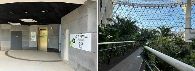관람이 마무리 되어갈 때 즈음 엘리베이터와 계단이 보인다. 2층 스카이워크로 향하는 통로다. 스카이워크는 온실 가장자리를 따라 공중에 떠있는 길이다. 온실 전경을 한눈에 담을 수 있으며 키가 큰 식물을 보다 가까이서 볼 수 있다는 묘미가 있다.