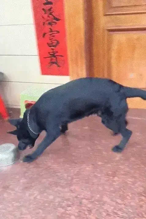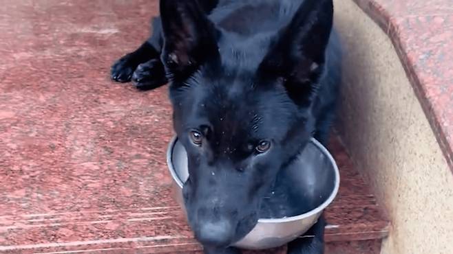 검은 강아지가 갑자기 밥그릇을 물었는데, 너무 조급한 탓인지 걷다가 '쿵' 소리와 함께 떨어뜨리고 말았습니다. 땅에 엎어진 밥그릇을 다시 물려고 했지만 쉽게 되지 않아 얼마나 애타했을까요.