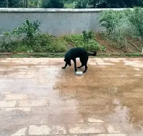 검은 강아지가 갑자기 밥그릇을 물었는데, 너무 조급한 탓인지 걷다가 '쿵' 소리와 함께 떨어뜨리고 말았습니다. 땅에 엎어진 밥그릇을 다시 물려고 했지만 쉽게 되지 않아 얼마나 애타했을까요.