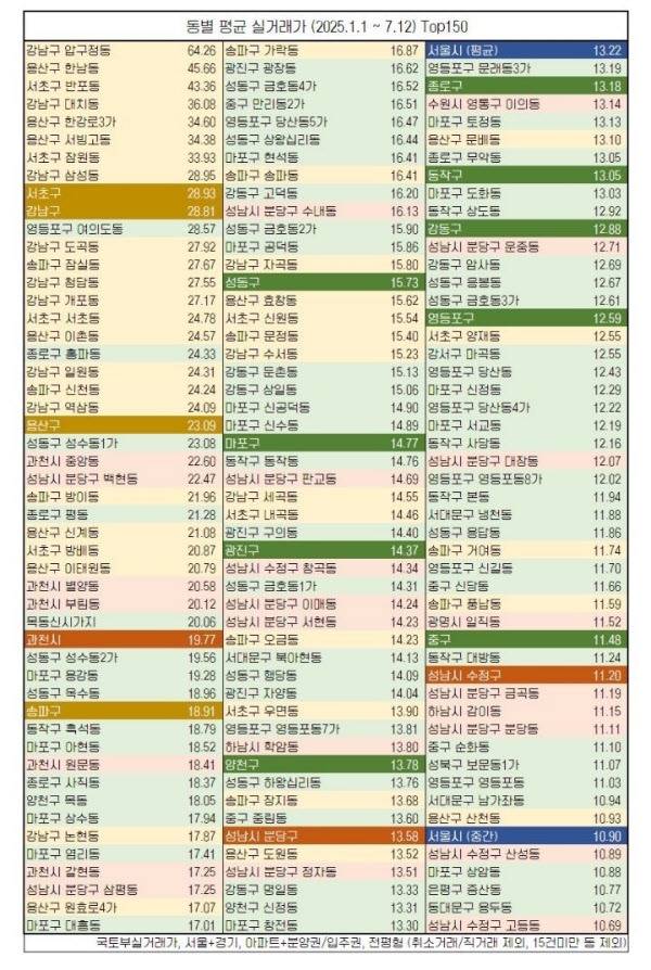 최근 온라인 커뮤니티에 올해 1월 1일부터 7월 12일까지 서울 및 경기권 동별 아파트 평균 실거래가를 가격이 높은 순서대로 정리한 그래픽이 화제를 모으고 있다. 올해 동마다 거래된 아파트 가격이 얼마인지 대략 알 수 있어 눈길을 끄는 것. 한국 집값이 비싼 150개 동을 실거래가 순으로 정리한 일종의 ‘톱 150 주택가격표’이다.