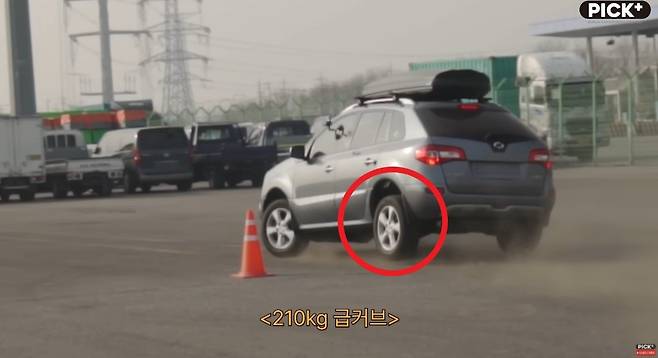 최대적재하중을 초과 한 시점, 100kg과 210kg의 무게를 추가로 더했을 때 실질적으로 위험하다는 느낌을 받기 시작하였습니다. 여기서 느꼈던 ‘위험’이란 실제로 차가 뒤집힐 수도 있겠다는 느낌을 직감했다는 것인데요. 코너 방향의 앞뒤 바퀴, 특히 뒷바퀴 부분이 상당히 위험한 수준까지 들려 전복 위험이 상당히 높아 보였습니다.