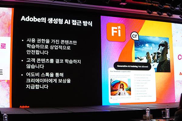 이때 가장 걱정되는 부분은 아무래도 저작권 문제다. 어도비는 이를 해결하기 위해 생성형 AI 활용에 상업적으로 안전한 콘텐츠로 학습하였으며, 고객의 콘텐츠는 학습에서 제외하였다. 이러한 신뢰를 바탕으로 2023년 3월 파이어플라이를 공개한 이후 사용자는 어도비를 통해 180억 개의 이미지를 생성했다.