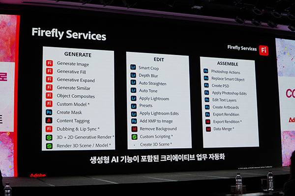 어도비는 포토샵, 일러스트, 라이트룸, 파이어플라이, 인디자인, 프리미어 프로 등 다양한 소프트웨어에 생성형 AI를 도입하였으며, 특히 프롬포트 입력만으로도 사용자는 별도의 디자인 작업 없이도 원하는 이미지를 생성할 수 있게 된다.