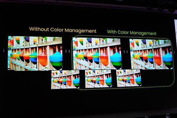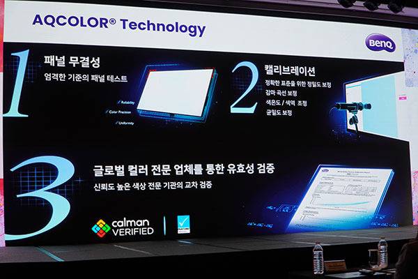 또한 AQ컬러(AQCOLOR) 기술에 대해서도 설명하였는데 AQ컬러란 3가지 조건을 충족해야 가능한 기술로 각각 패널 무결성과 캘리브레이션, 그리고 클로벌 컬러 전문 업체(칼맨, 팬톤)을 통한 유효성 검증을 거쳐야만 가능하다고 전했다.