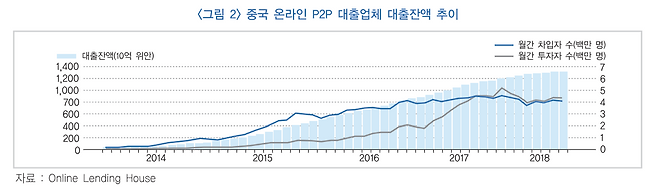 = 당시 중국에서는 사인간 금융거래인 P2P 대출 부실이 사회적 문제로 대두됐다. 2018년 금융연구원이 발간한 ‘중국 온라인 P2P 대출업체 파산 증가 및 시사점’에 따르면 그해 상반기에만 경영진이 도주하거나 경찰 수사를 받는 부실 P2P 대출업체가 150곳에 달했다. 그 전해에도 217곳이 도산했다. 운영중인 P2P 금융업체 수만 2천 곳에 육박하고, 대출 잔액이 214조원에 달했다.
