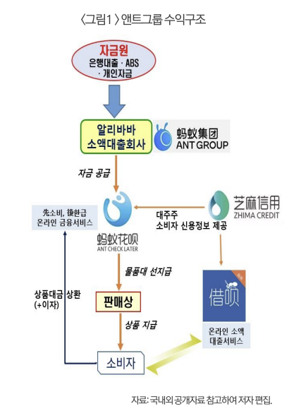 = 앤트그룹을 비롯한 중국이 핀테크 회사들은 이런 일을 했다. 앤트그룹은 알리바바의 상거래 행위를 통해 축적한 데이터를 기반으로 금융 사업을 했다. 허베이는 신용카드 회사처럼 선결제 후지불 방식의 금융업을, 제베이는 신용대출을 했다. 대출이 이뤄지면 이를 상환받을 수 있는 권리, 대출채권이 생긴다. 앤트그룹은 대출채권을 구조화해서 유동화증권(ABS) 형태로 팔았다. 팔아서 확보한 자금을 다시 대출 재원으로 활용하며 그림자 금융을 확대했다.