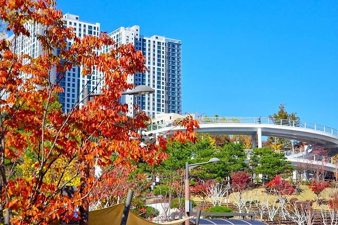 성남의 악명 높은 고지대 지형을 편하게 오를 수 있는 나무 덱길을 설치하여 시민들의 편리함을 높여준 고마운 공원이라고도 할 수 있습니다. 또 나무 덱길을 걷다 보면 단풍이 물든 나무들도 함께 관람할 수 있어 성남 가볼 만한 곳으로도 참 좋은 곳입니다.