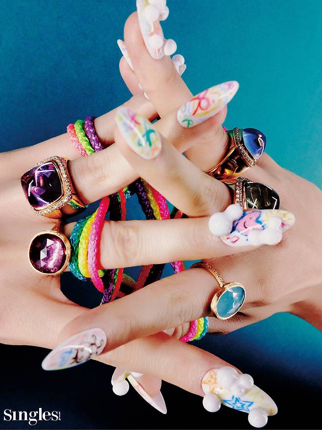 알록달록한 네일 아트에 유색 주얼리를 끼고 유년 시절로 돌아가다.