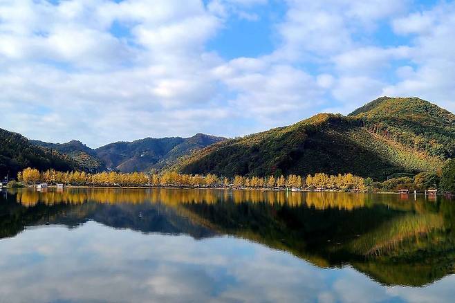 괴산 문광저수지는 가을만 되면 은행나무를 보기 위해 전국 각지에서 몰려들 정도로 풍경이 운치있다. 약 2km에 걸쳐 300여 그루의 은행나무가 저수지 둘레를 따라 늘어서 있어서 사진 찍기에도 제격.