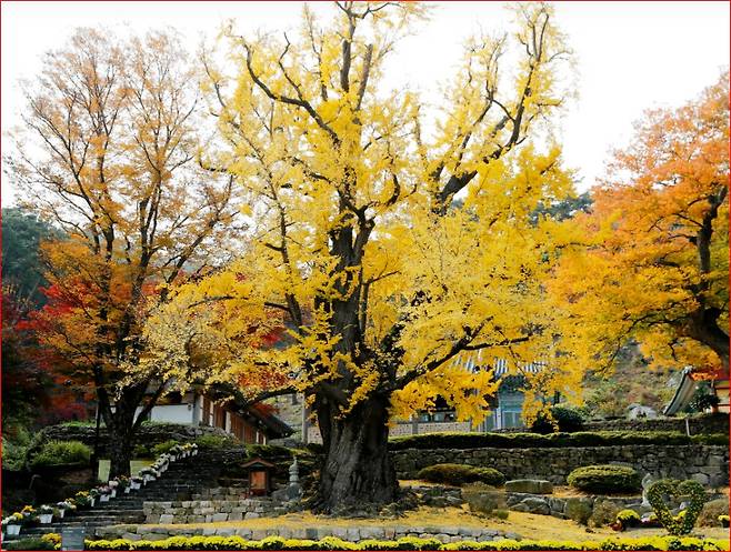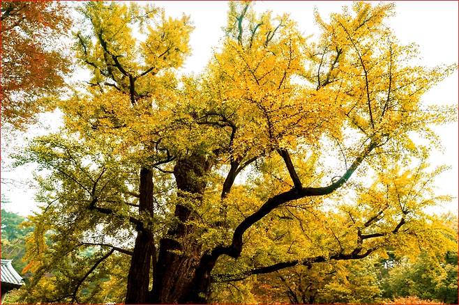 노란 잎 사이로 보이는 대웅전의 단청빛이 한 폭의 그림처럼 조화를 이루며 가을 풍경을 완성합니다.