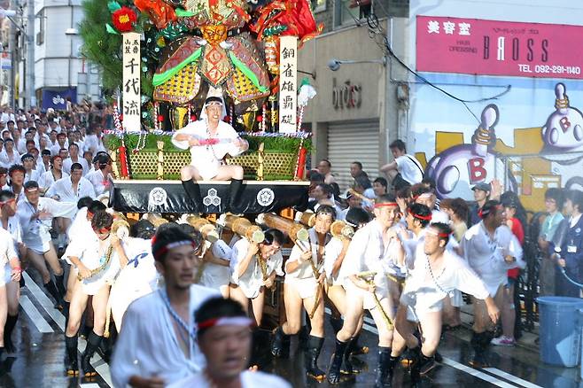 매년 7월 1일부터 15일까지 후쿠오카 텐진 지역과 하카타역 주변에서 열리는 770년의 역사의 전통 축제, 하카타 기온 야마카사입니다. 거대한 야마카사(장식 가마)를 짊어지고 달리는 '오이야마'경주가 이 축제의 하이라이트라이트 인데요. 무게 1톤이 넘는 가마를 맨발로 들고 뛰는 모습은 현지인들의 단결력을 제대로 엿볼 수 있죠.