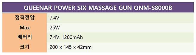 퀸나 파워식스 마사지건 QNM-S8000B는 심플한 디자인에 버튼 하나로 모든 조작이 가능해 누구나 간편하게 사용할 수 있다. 또한 6단계의 강도 조절 기능으로 사용자의 상태나 취향에 맞게 설정할 수 있으며, 최대 4000rpm의 파워풀한 모터로 속근육까지 시원하게 풀어줄 수 있다. 그뿐만 아니라 1200mAh의 대용량 배터리로 한 번 충전에도 오래 사용할 수 있으며, 가벼운 무게와 우수한 그립감으로 사용성 측면에서도 좋은 점수를 받을 수 있을 것으로 기대된다.