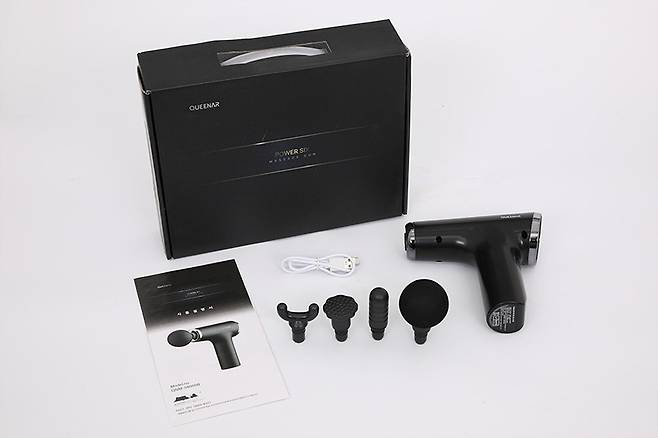 박스 안에는 퀸나 파워식스 마사지건 QNM-S8000B 본체와 교체용 헤드, 충전용 USB 케이블, 그리고 사용 설명서가 구성품으로 들어 있다.