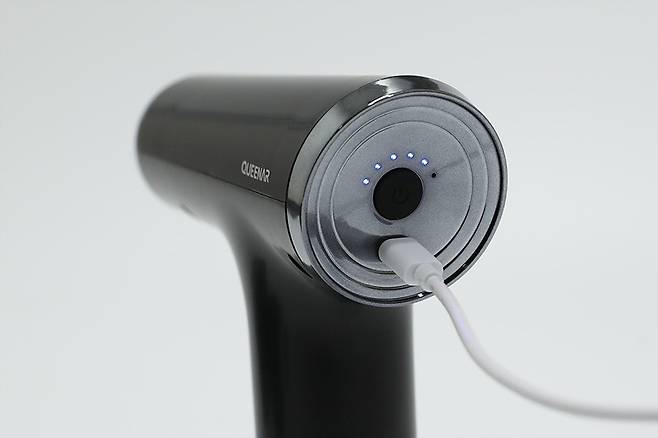 퀸나 파워식스 마사지건 QNM-S8000B를 사용하기 전에 우선 내장 배터리 충전을 해주어야 한다. 충전 시에는 버튼 위의 LED 상태 표시등이 점멸하면서 배터리 충전 상태를 알려준다.