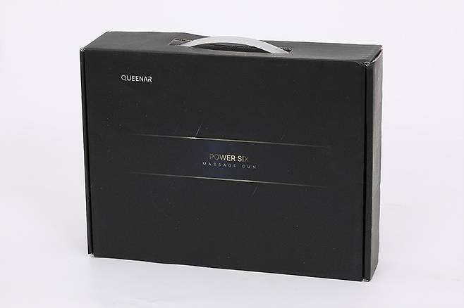 퀸나 파워식스 마사지건 QNM-S8000B는 검은색 합지박스에 담겨 있다. 박스 앞면에는 제품 이미지 없이 제품명만 인쇄되어 있기 때문에 개봉 전에 디자인이나 구성을 확인하기는 어렵다.