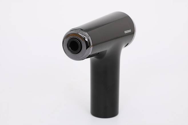 본체 앞쪽에는 유광 처리된 부분이 있고, 그 중심에 노즐이 보인다. 이 부분에 교체형 헤드를 끼워서 사용하는 형태이다.