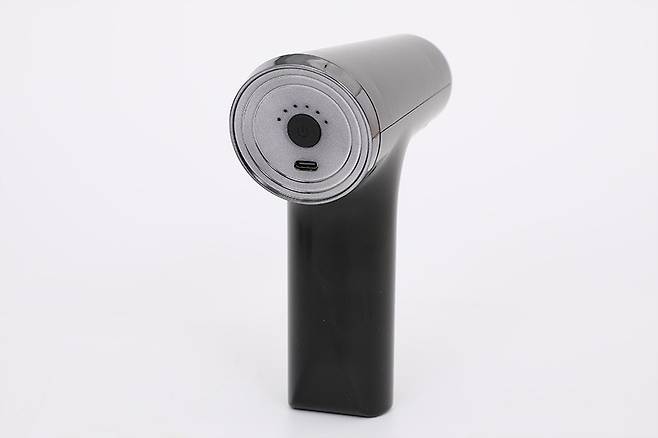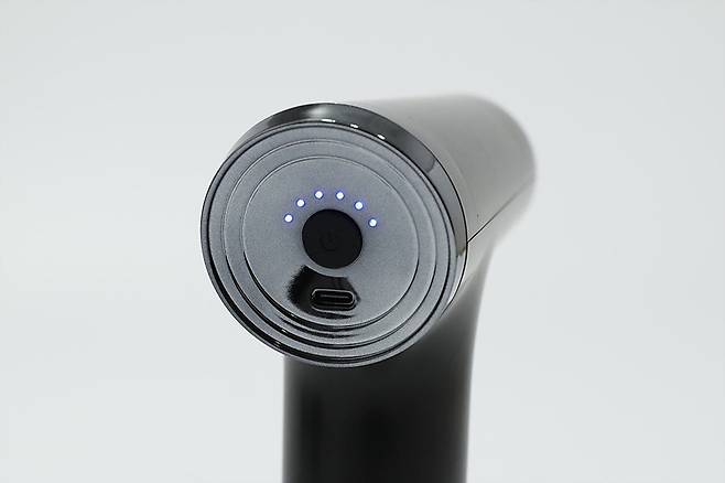 노즐의 반대편 끝부분에도 유광 처리된 곳이 있는데, 그 중심에는 원형 버튼이 자리 잡고 있다. 버튼의 위쪽에는 여섯 개의 LED 상태 표시등이 있고, 버튼 아래에는 USB C타입 포트가 위치해 있다.