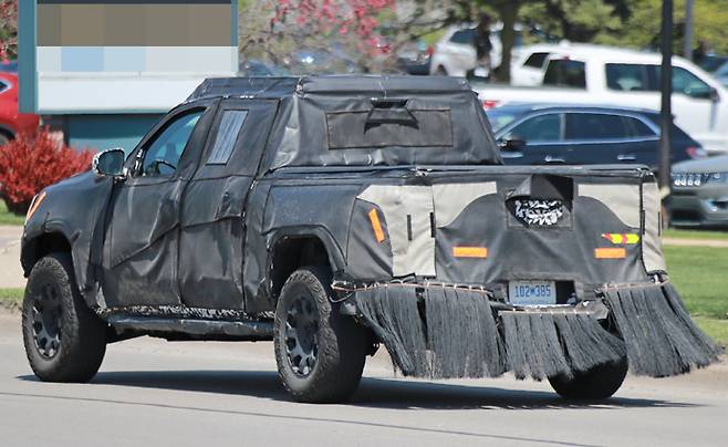 이 트럭은 스노클과 함께 루프 랙과 일부 오프로드 범퍼를 숨기고 있는 것 같다. 머드 터레인 타이어가 장착된 검은색 휠 세트가 현재 확인된 하이브리드 엔진의 파워를 전달할 것으로 예상된다