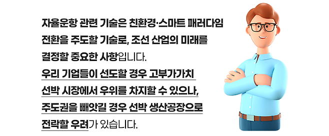 하지만, 앞으로 친환경 선박 수주 외에도 원격 제어∙조정이 가능한 자율운항 기술 개발에도 박차를 가하여 산업 경쟁력 우위를 이어가야 합니다.