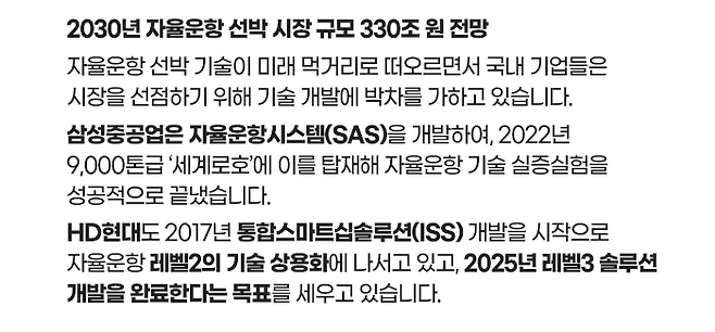 HD현대의 자율운항 전문 자회사인 아비커스가 2022년에 세계 최초로 대형 선박을 자율운항해 태평양을 횡단해 주목을 받았는데요. 대우조선해양도 자체 스마트십 솔루션 ‘DS4’를 개발해 시험선 ‘단비(DAN-V)’로 자율운항을 시험 중이며, 제부도 인근 해역에서 자율운항 선박 해상실험에 성공했습니다.