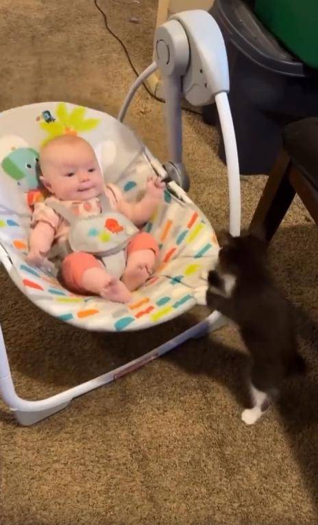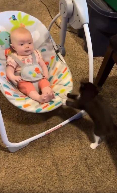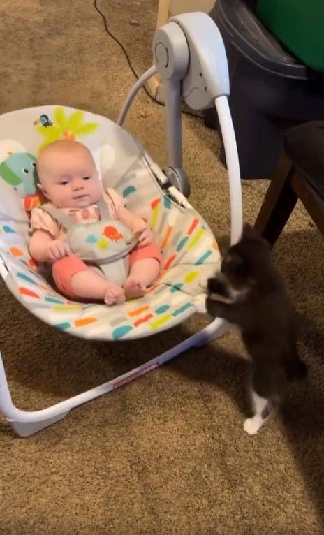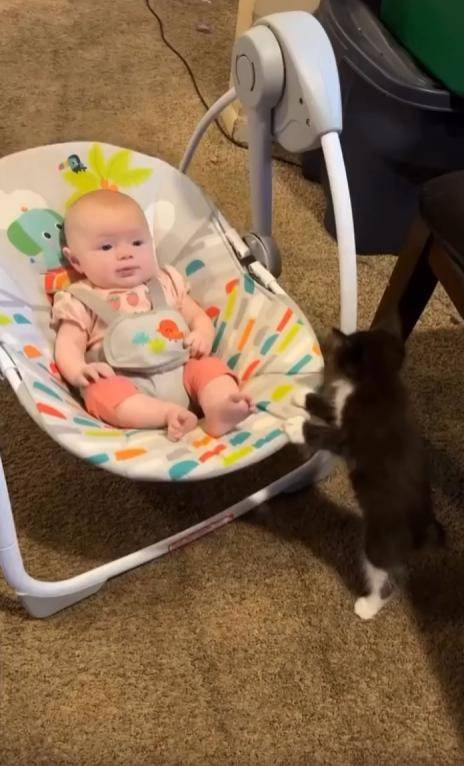 이 모습은 단순한 장난도, 우연한 순간도 아니었습니다. 고양이는 아기를 향한 신기함과 조심스러움을 동시에 품고 있었습니다. 흔들침대가 멈추면 다시 앞으로 다가와, 작게 ‘미는’ 동작을 반복하던 그 모습은 말 그대로 “한 아기가 다른 아기를 도와주는” 장면이었죠.