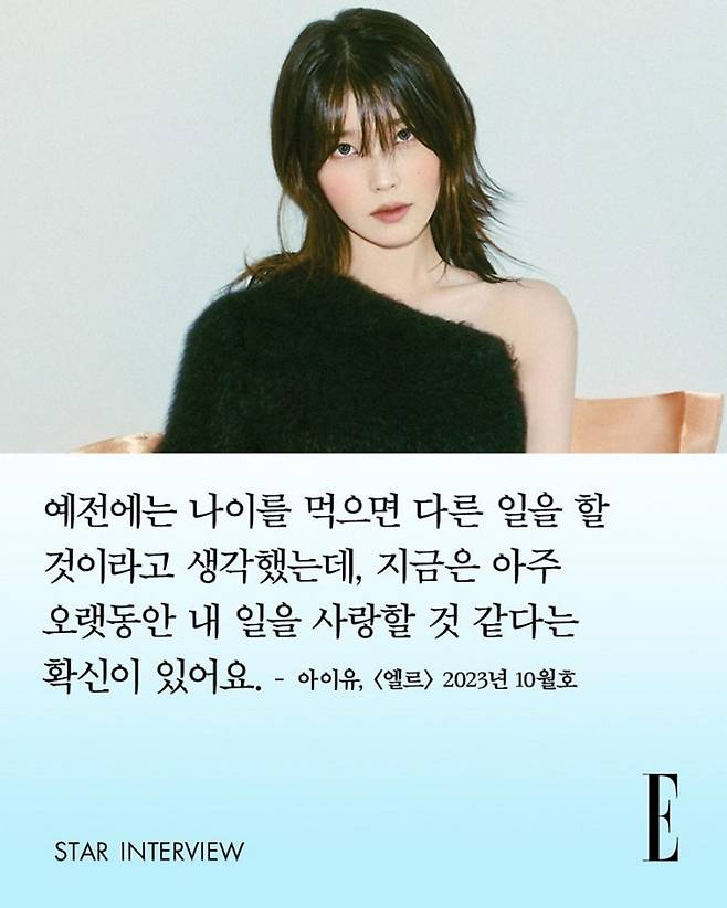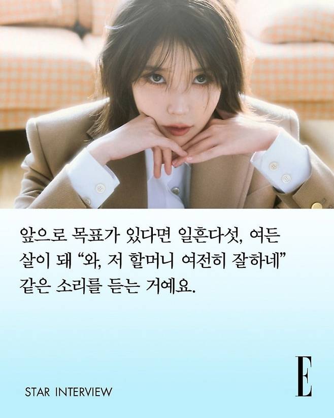 • 아이유: “앞으로 목표가 있다면 일흔다섯, 여든 살이 돼 ‘와, 저 할머니 여전히 잘하네’ 같은 소리를 듣는 거예요. 예전에는 나이를 먹으면 다른 일을 할 것이라고 생각했는데, 지금은 아주 오랫동안 내 일을 사랑할 것 같다는 확신이 있어요.” (엘르 2023년 10월호)