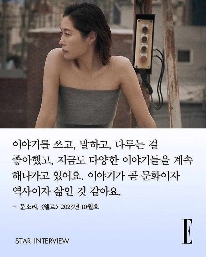 • 문소리: “하다 보면 자꾸 일이 커져요. 친구들이랑 대화하다가도 ‘우리 이거 해볼까?’ 하면서 자연스럽게 기획하고, 발전시키죠. 이야기를 쓰고, 말하고, 다루는 걸 좋아했고, 지금도 다양한 이야기들을 계속 해나가고 있어요. 이야기가 곧 문화이자 역사이자 삶인 것 같아요.” (엘르 2023년 4월)