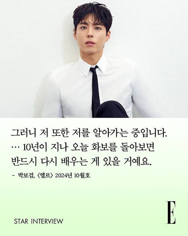 • 박보검: “자신에 대해 완벽히 아는 사람이 있을까요? 다양한 경험을 하고, 오늘처럼 여러 질문에 답하면서 저에 관해 새롭게 발견하게 되는 점들이 생겨요. 그러니 저 또한 저를 알아가는 중입니다…. 10년이 지나 오늘 화보를 돌아보면 반드시 다시 배우는 게 있을 거예요.” (엘르 2024년 10월호)