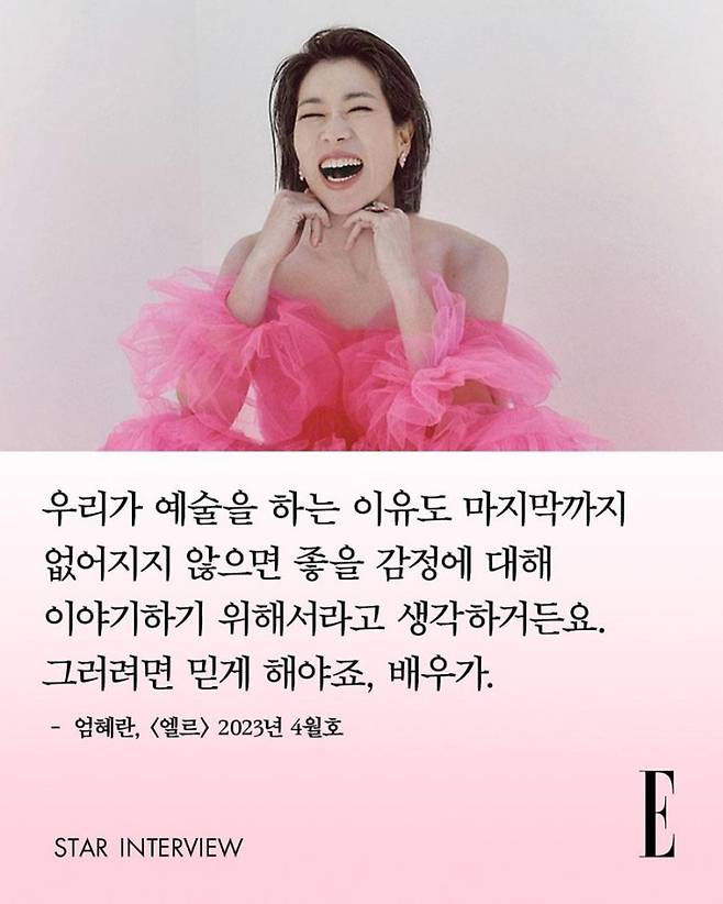 • 염혜란: “우리를 일으켜주는 건 다 선한 사람들이라고 생각해요. 아직 살 만하는 걸 믿을 수 있도록, 그런 희망으로 살 수 있게 연기하고 싶어요. 우리가 예술을 하는 이유도 마지막까지 없어지지 않으면 좋은 감정에 대해 이야기하기 위해서라고 생각하거든요. 그러려면 믿게 해야죠. 우리가.” (엘르 2023년 4월호)
