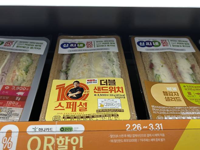 더블 샌드위치는 사라다 샌드위치를 재현한 것으로 '햄감자'와 '콘마요 사라다' 두 가지 맛을 담고 있어요.
