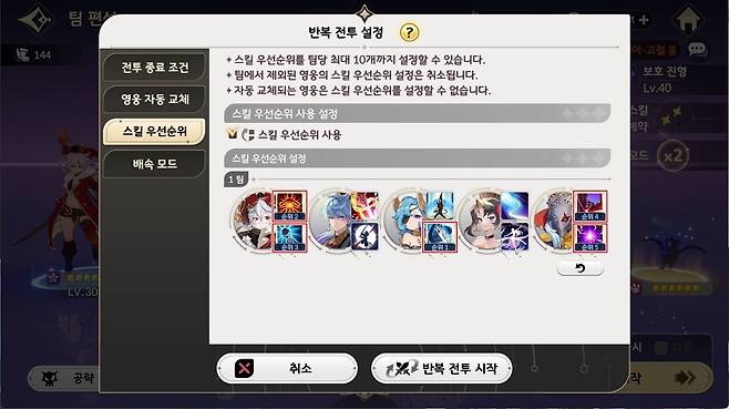 가장 먼저 파스칼 세팅은 기본적으로 궁극 강화 2단계까지 진행하여 복수자 4세트 효과를 확보해야 하며, 추가로 치명타 확률도 50% 이상 맞춰야 한다. 이외에 궁극 강화가 필요한 영웅은 에이스, 빅토리아 정도다. 루시나 아수라는 중간에 전사해도 괜찮지만, 빅토리아(마비 면역)와 에이스(방어력 감소)는 끝까지 생존해야 한다.