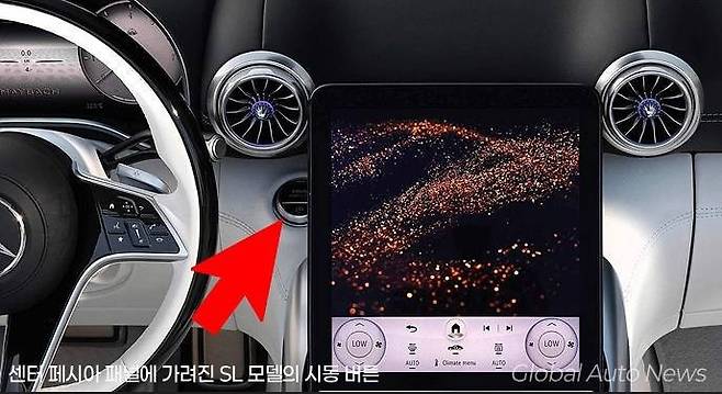그런데 마이바흐 SL의 운전석에서 한 가지 눈에 띄는 것이 있는데요, 그것은 센터 페시아 패널에 일부가 가려진 시동 버튼입니다. 마치 원래 없던 센터 페시아를 덜렁 얹어놓은 느낌입니다.