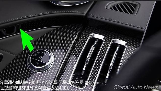 이 노브를 돌리면 순서대로 우측 주차등, 좌측 주차등, 미등, 오토 라이트, 안개등의 순으로 켜고 끌수 있습니다. 이 노브는 S 클래스에서는 사진처럼 운전자가 눈으로 보고 조작할 수 있는 위치와 각도에 설치돼 있지만, 7세대 SL모델에서는 시선의 방향과 직각으로 아래쪽을 향하고 있어서 눈으로 확인하고 조작하기는 불가능해 보입니다.