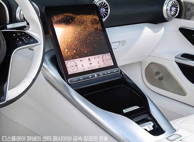 넓은 디스플레이 패널의 센터 페시아와 앞 콘솔에 배치된 지붕 개폐 스위치 등이 눈에 띕니다. 물론 앞 콘솔에는 시프트 레버는 없습니다. 최근의 벤츠 차량의 인터페이스는 스티어링 휠 우측의 레버로 변속기 조작을 하도록 설계돼 있기 때문입니다.