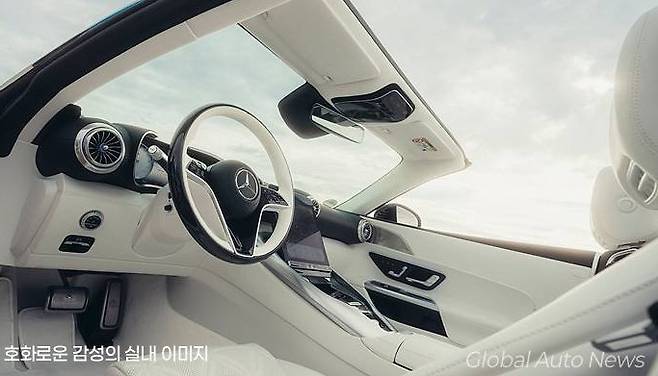 호화로운 이미지는 실내에서도 강조돼 있습니다. 내장 색상은 물론 선택할 수 있겠지만, 제시된 이미지에서는 산뜻한 백색에 가까운 가죽으로 마감된 좌석과 트림 패널 등등을 볼 수 있습니다. 여기에 금속 질감의 둥근 환기구와 벤츠 특유의 센터 페시아 디스플레이 패널, 그리고 삼각별이 새겨진 스티어링 휠 등으로 구성된 실내 이미지는 호화로움을 강조하고 있습니다.